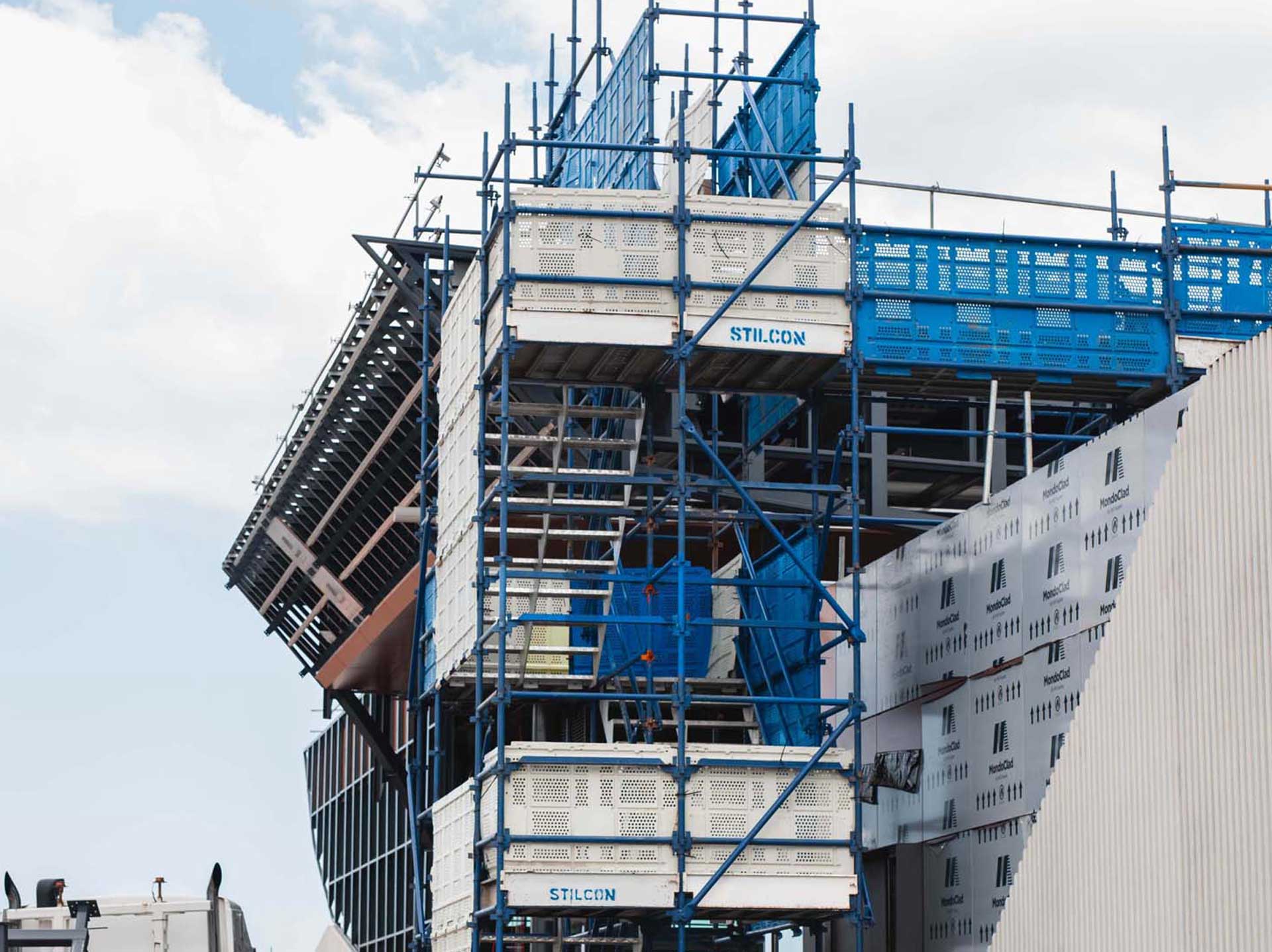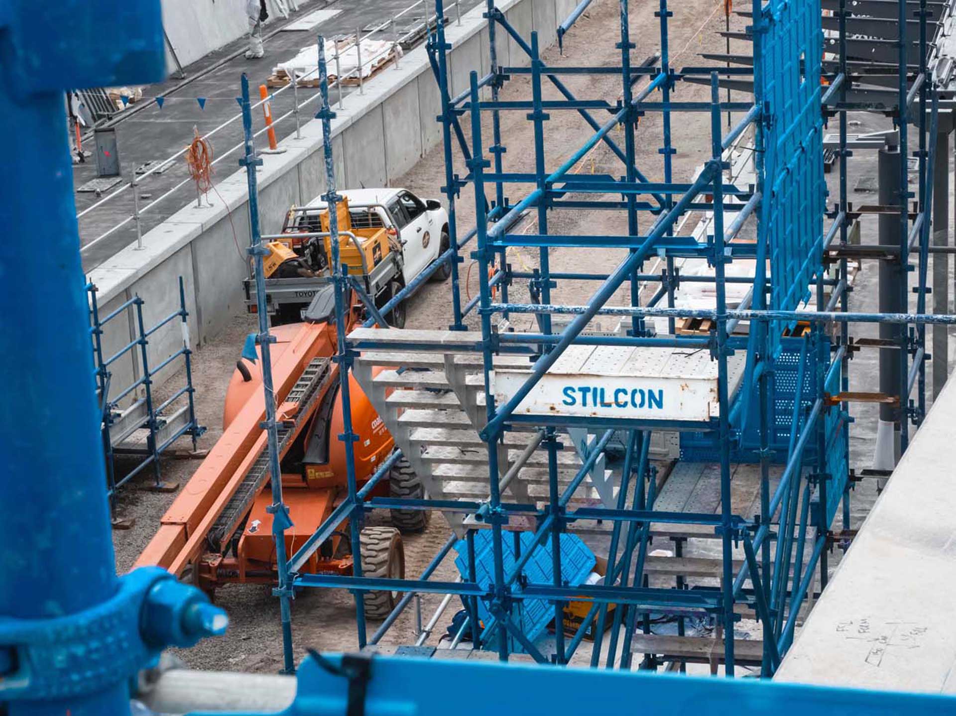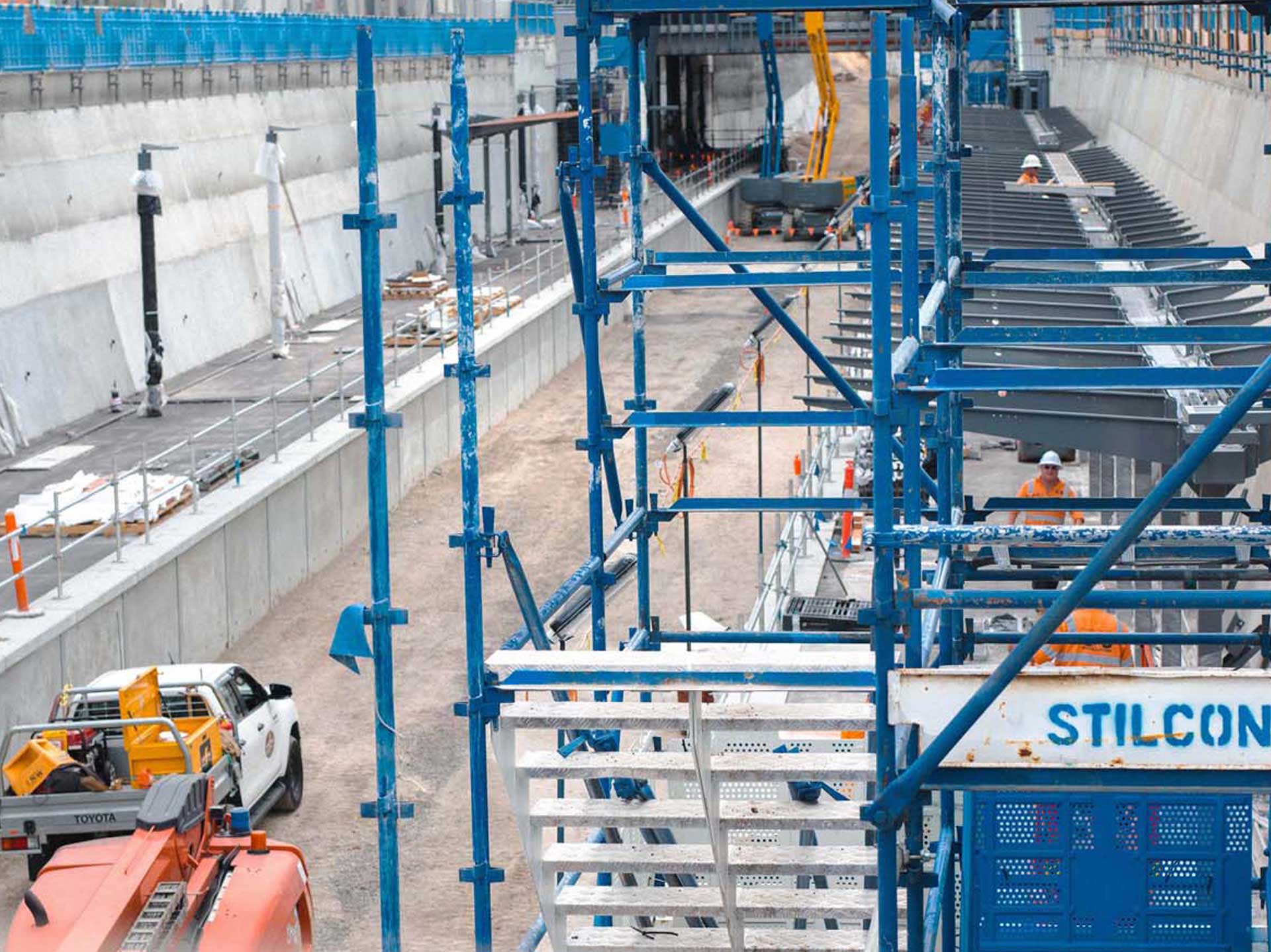 At the Glenroy Road level crossing removal project, the rail line was lowered under the road and a brand-new Glenroy Station was constructed. SIS delivered a groundbreaking access solution that showcased our engineering innovation and technical expertise in the rail infrastructure sector. The centrepiece of our contribution was an 18 metre Layher scaffold pedestrian bridge spanning from one platform to another—the first of its kind on any level crossing project in the Southern Hemisphere. This fully DDA & BCC-compliant structure featured two stretch stairs adjoining either side of the main span, ensuring accessibility while maintaining the project’s stringent safety standards.