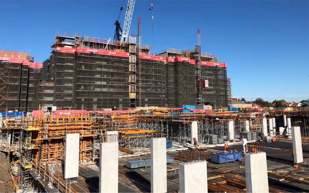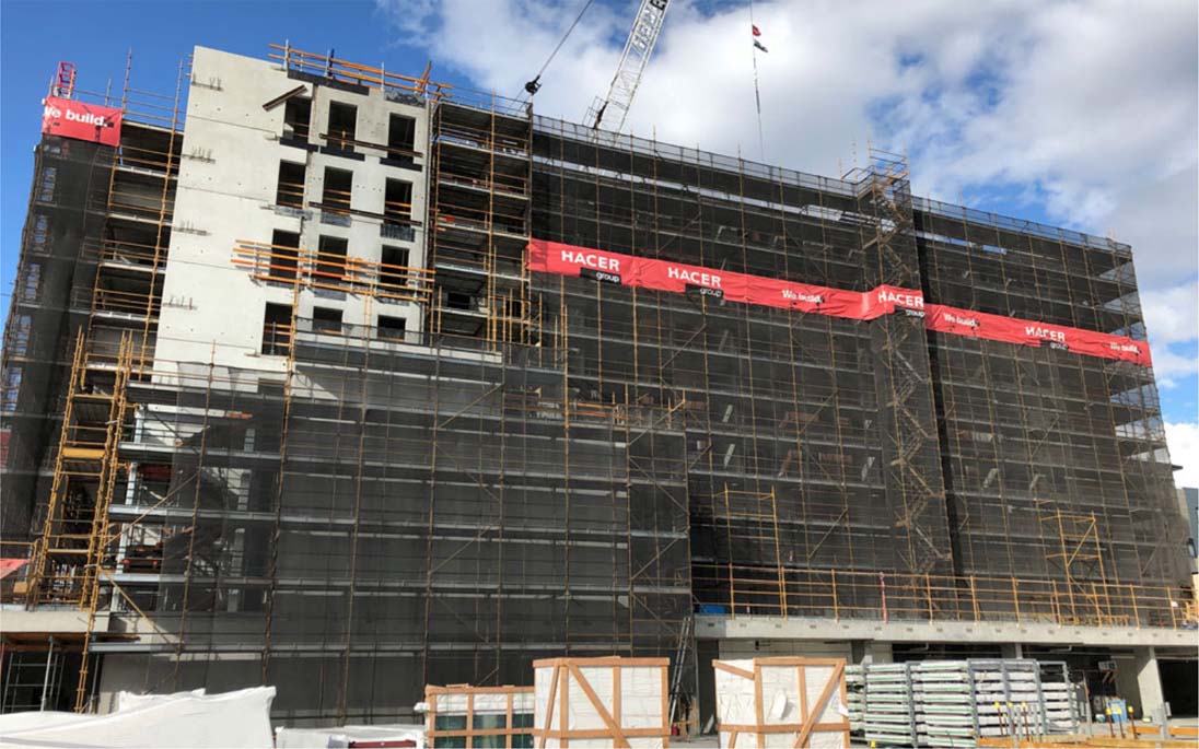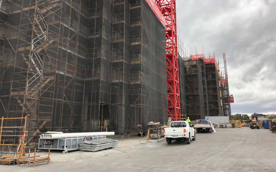 This project saw the team working on a site of 1.8 hectares and logistically providing 2000 tonnes of scaffolding while needing to work with their cranage and structural team, across three separate apartment builds from the ground to 30 metres high. Our design and engineering team reviewed the architectural of the building and supplied issued for construction drawings. This ensured the client could understand the parameters of the perimeter scaffold and how it met their unique requirements to be able to work in and out at the different levels of the façade of the three buildings. To achieve accuracy and additional safety, Stilcon Industrial Services supplied its own surveying team to pinpoint the scaffold from the grid lines – this ensured the structural team got the safe perimeter scaffold while the finishing trades team were working on a safe scaffold.