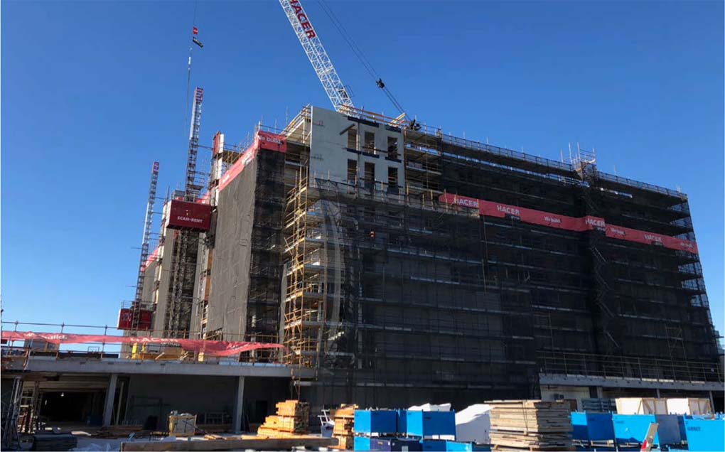 Stilcon Industrial Services provided a perimeter scaffolding 25 to 30 metres high with full wrap to create protection while the building was in construction. The team provided survey points to build the scaffold for the one build but two process build where the structures team and the finishing trades could work together. The encapsulation also helped reduce falling hazards.