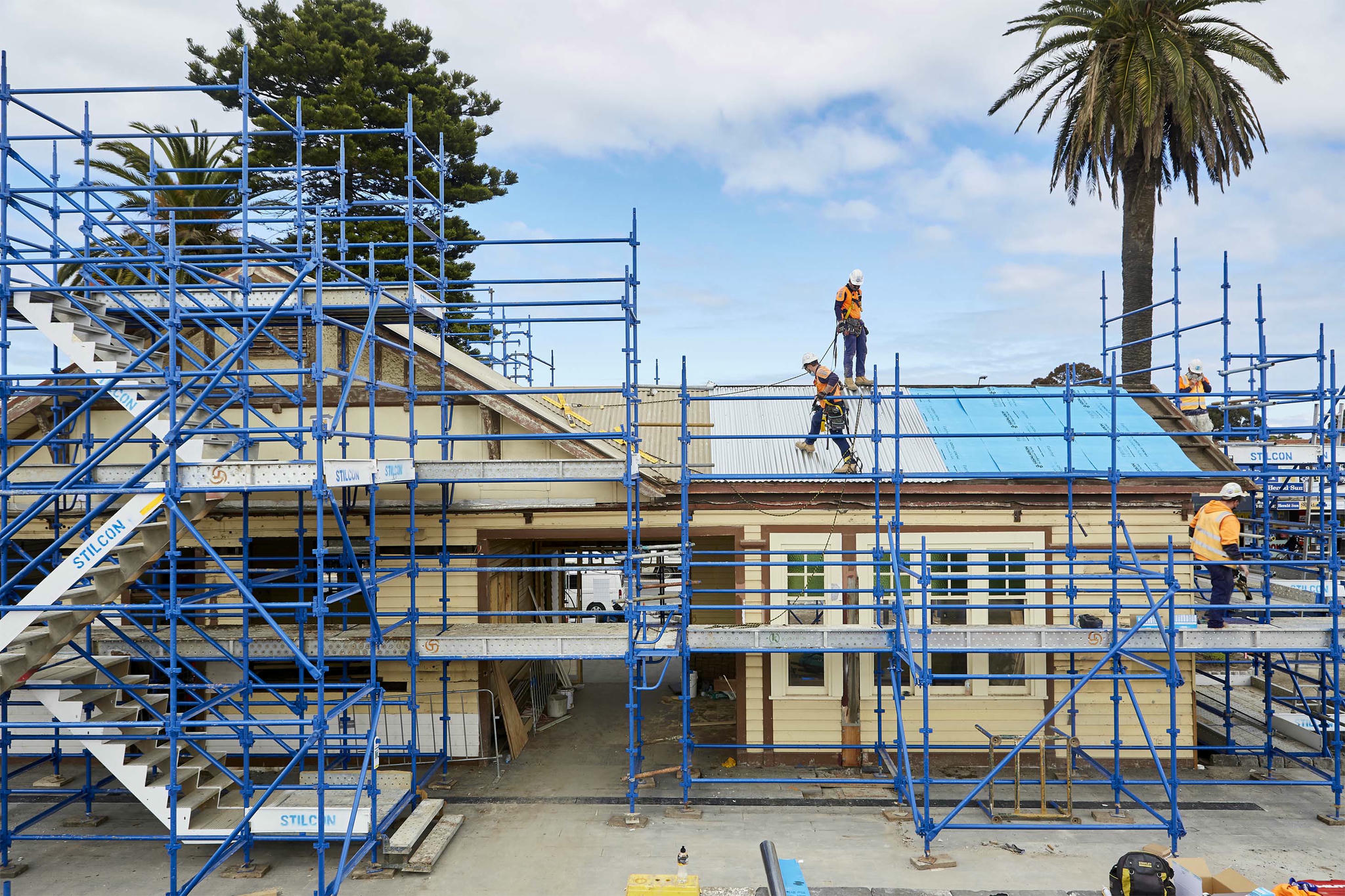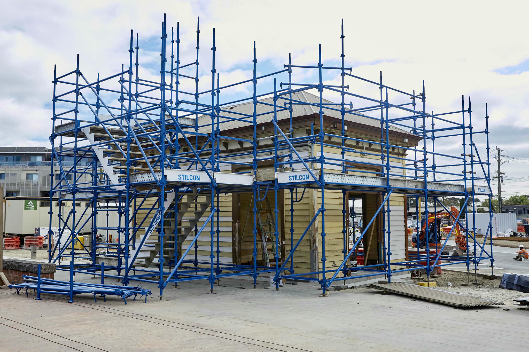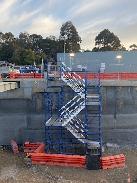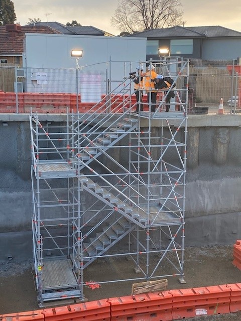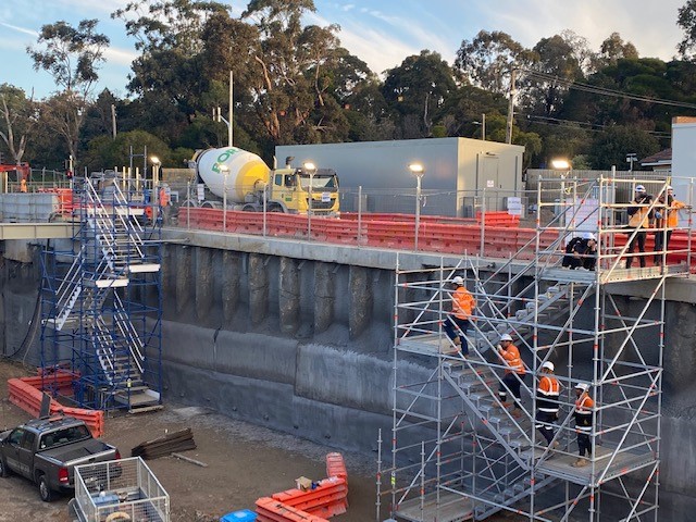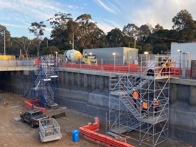 The Mentone & Cheltenham Station level crossing removal required a 14-metre cut into sand belt land. Stilcon Industrial Services assisted with the restoration of the two heritage listed stations. The design and engineering team designed compliant layher stretcher stairs that could be craned into position and incorporated with the cut of the 14 metres. The stairs were built in four metre sections and the cut was 4 metres below the road level. Stilcon Industrial Services provided bridge scaffold from one side of the cut to the other, spanning approximately 18 metres.